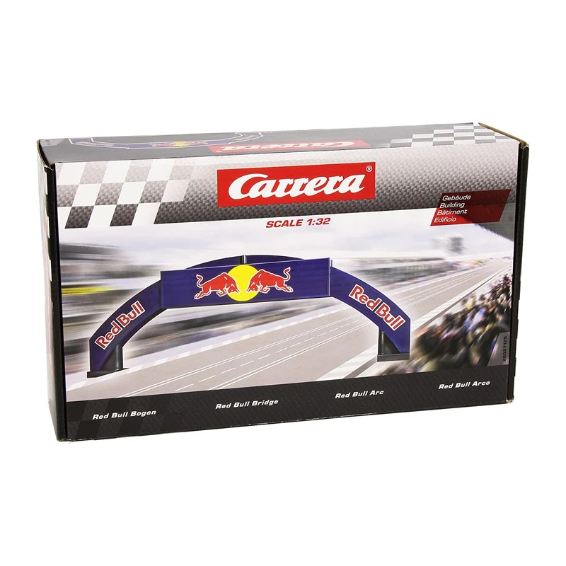 Carrera Fans ergänzen ihre Rennstrecke mit dem Red Bull Bogen einfach perfekt. Egal, ob Du mit dem Bogen Start oder Ziel markieren willst oder aber auf Mitte der Strecke für einen Eyecatcher sorgen möchtest, der Bogen wird an jedem Platz Deiner Carrera Bahn eine gute Figur machen. Durch die originale Red Bull Lizenz wirkt der Bogen auf Schienen im Maßstab 1:32 besonders authentisch. Beim Aufbau hast Du zwei Möglichkeiten: entweder zwei Spuren inklusive Randstreifen oder vier Spuren exklusive Randstreifen. Die Teile des Bogens lassen sich ganz einfach zusammenbauen und mit den beiliegenden Stickerbögen perfekt verzieren. Mit dieser tollen Dekorationsmöglichkeit ist ein echtes Rennfeeling im heimischen Wohnzimmer garantiert – probiere es doch einfach mal aus!