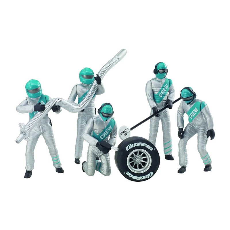 Was wäre ein Autorennen nur ohne Mechaniker, die alles am Laufen halten und für Reparaturen, Reifenwechsel und Co. sorgen? Klar, dass ein Mechaniker-Team auch auf Deiner heimischen Carrera Bahn auf gar keinen Fall fehlen darf! Der Mechaniker-Figurensatz besteht aus fünf Figuren. Im silber-blauen Design gestaltet, macht die Crew optisch richtig etwas her. Die Figuren punkten außerdem mit der detailgetreuen Verarbeitung und ihren drehbaren Körperteilen, die für noch mehr Authentizität sorgen. Kein Boxenstopp und sicheres Fahren ohne die Mechaniker Crew, damit Dein Slotcar wie im echten Race wieder sicher auf die Strecken gehen kann.