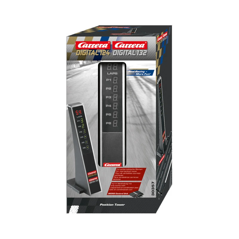Schnell verliert man bei rasanten Rennen den Überblick darüber, wer tatsächlich vorne liegt. Und wer hat bei all der Action auch noch die Zeit, sich die Anzahl der Runden zu merken? Abhilfe schafft hier der Position Tower von Carrera. So hast Du immer die Kontrolle über Deine aktuelle Rennposition, wenn Du gegen andere Fahrzeuge antrittst. Deine Konzentration liegt so voll und ganz bei Deiner Fahrleistung. Der Tower hat nicht nur praktische, sondern auch optische Vorteile. Er verleiht dem Fahrspaß noch mehr Authentizität und ergänzt die Strecke um ein cooles Feature. Auf der LED-Anzeige erscheinen die Anzahl der Runden und die Position des führenden Fahrzeugs. Der Position Tower wird mit einer Adapter Unit geliefert und passt mit deren Maßstab von 1:24 für die Carrera DIGITAL 124 und Carrera DIGITAL 132 Rennbahn. Funktioniert nur in Verbindung mit der Control Unit (30352).