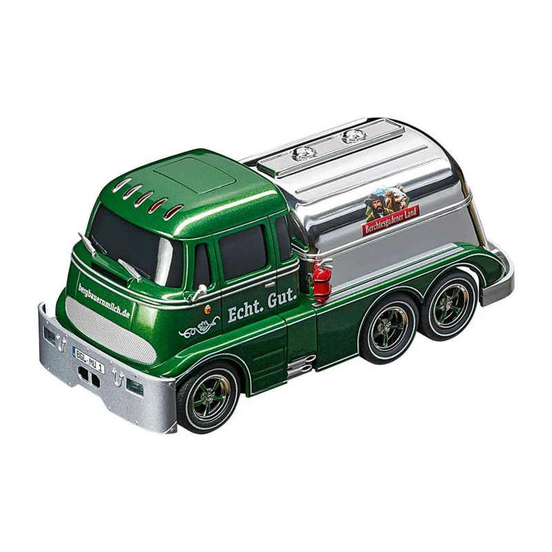 Der Carrera Tanker versorgt die Boxengasse und Rennwagen zuverlässig mit Sprit. Im metallic Grün präsentiert sich der Tanker und wird mit dem „Berchtesgadener Land“ Design zum unverwechselbaren Hingucker auf der Carrera Bahn. Das Slotcar kommt im Maßstab 1:32 um die Ecke und begeistert durch liebevolle Details. Mit seinem akustischen Signal wird das Tankauto nicht nur zum optischen Highlight auf der Carrera Rennbahn. Das Carrera Auto lässt sich individuell codieren und digital steuern. Spaß ist auf jeden Falll abwechslungsreich und macht mit diesem Tanker echt etwas her!