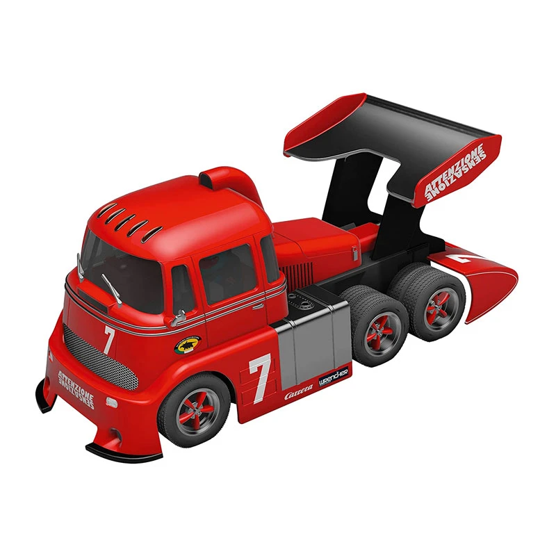 Im Rennen mit dem Carrera Race Truckster „No.7“ zeigst du, wer beim Elefantenrennen auf der heimischen Rennstrecke den Rüssel vorne hat. Der rote Truckster mit seinem abgerundeten Fahrerhaus und dem großen Heckspoiler macht auf der Piste einiges her. Im Windkanal hast du mit dem Kraftprotz allerdings schlechte Karten: Wind Schnittigkeit gehört nicht zu seinen Vorzügen.