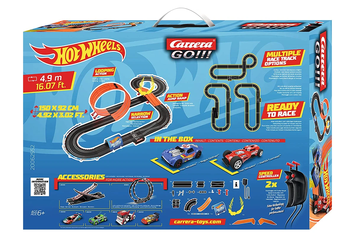 Im Carrera GO!!! „Hot Wheels™ 4.9“- Set schaffen es die beliebten Hot Wheels™ Autos endlich auf die Slotracing-Schienen. Der „Hot Wheels™ Night Shifter™“ und der „Hot Wheels™ HW50 Concept™“ liefern sich auf der 4,9 Meter langen Rennstrecke ein packendes Duell.