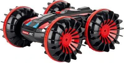 Das Carrera RC All-Terrain Stunt Car bewegt sich mit seinen extra-großen Reifen im Schaufelrad-Style auch durch jedes Gelände und tiefe Pützen. Der Terrain-Künstler ist dabei gegen eindringende Nässe geschützt und garantiert langen Spielspaß auch am Pool. Sogar Stunts sind mit diesem robusten Gefährt möglich: einen rasanten Überschlag schafft das Outdoor-Wunder spielend. Dabei kann der widerstandsfähige Flitzer mit einer Top-Speed von bis zu 10 km/h glänzen. Der All-Terrain Stunt Car wird mit einem 6,4V 700mAh LiFePo4 Akku und USB Ladekabel geliefert.