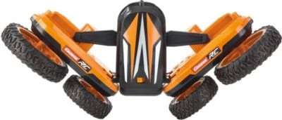 Achtung! Überschlag! Mit diesem coolen Carrera RC 2,4GHz Supercross ist alles möglich. Der Flipover punktet mit einer Differential-Steuerung und kann 360° Action auf vielen, auch unebenen Untergründen. Die gegenläufig steuerbaren Achsen ermöglichen es mit dem leuchtenden Modell jede Menge cooler Tricks und Stunts zu fahren. Für die Geländegängigkeit sorgen die unterschiedlich großen Reifen. Ein Extra sind die beiden Achsen, die im Super Spinning Mode V-förmig angewinkelt werden können. Bei einer Topgeschwindigkeit von bis zu 6 km/h bleiben keine Wünsche offen und die lässige 360° Drehung wird für staunende Augen sorgen.